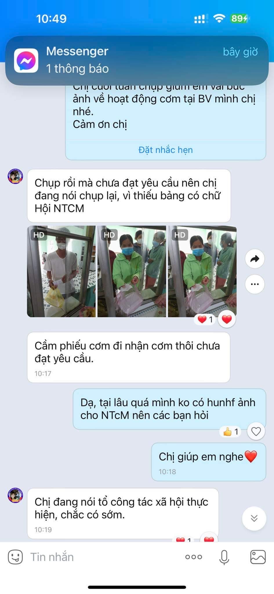 Sáng nay Linhthuc đã có nói chuyện với chị Ngân đề nghị chịđịnh kỳ có thể cung cấp cho NTCM một số hình ảnh về việc thực hiện hoạt động cơm miễn phí tại BV và chị đã hứa sẽ phối hợp nhất có thể cùng NTCM trong hoạt động này.