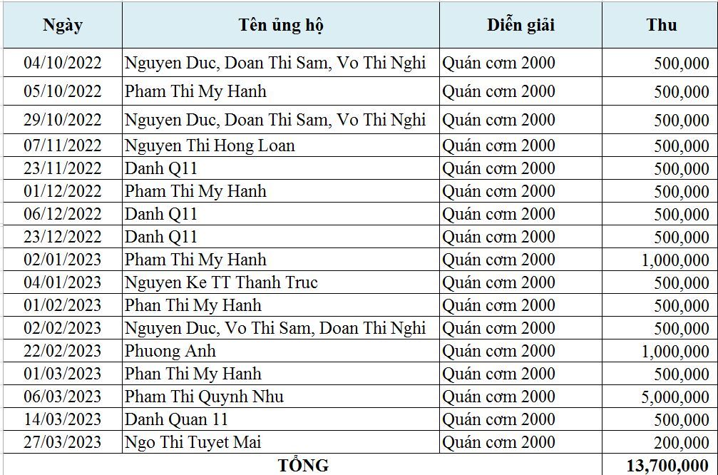 Quỹ cơm Saigon đã nhận: