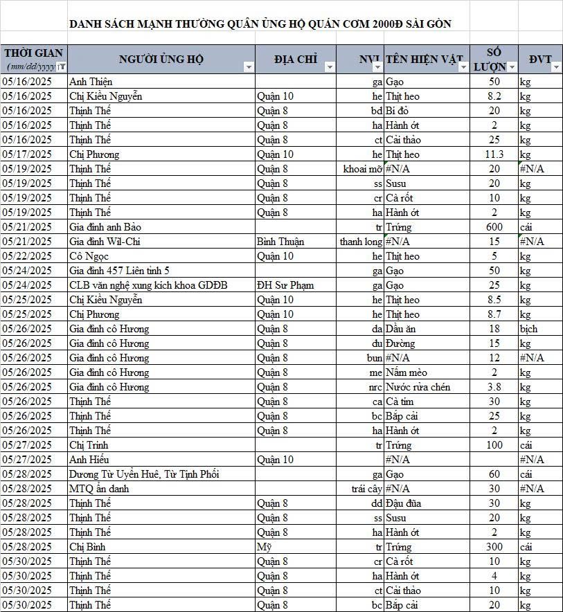 Quỹ cơm Saigon đã nhận: (từ ngày 15/5/25 đến 31/5/25)