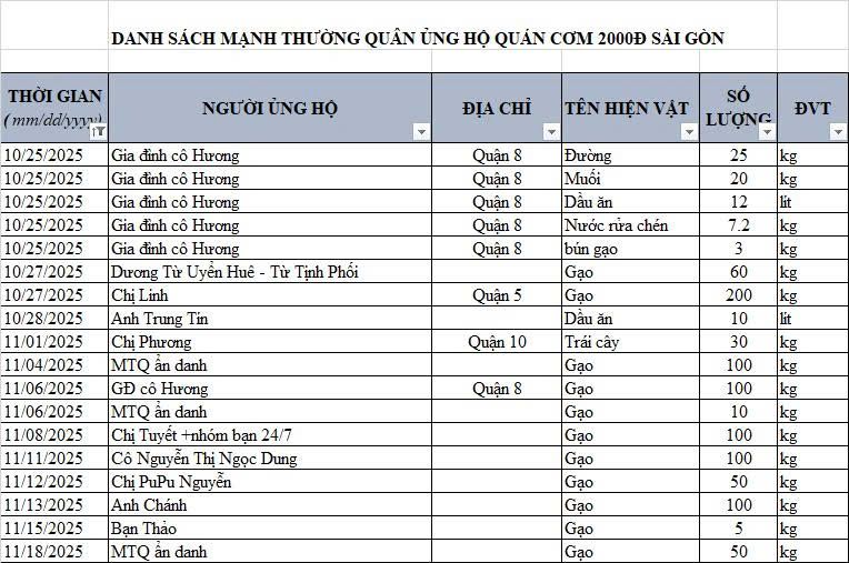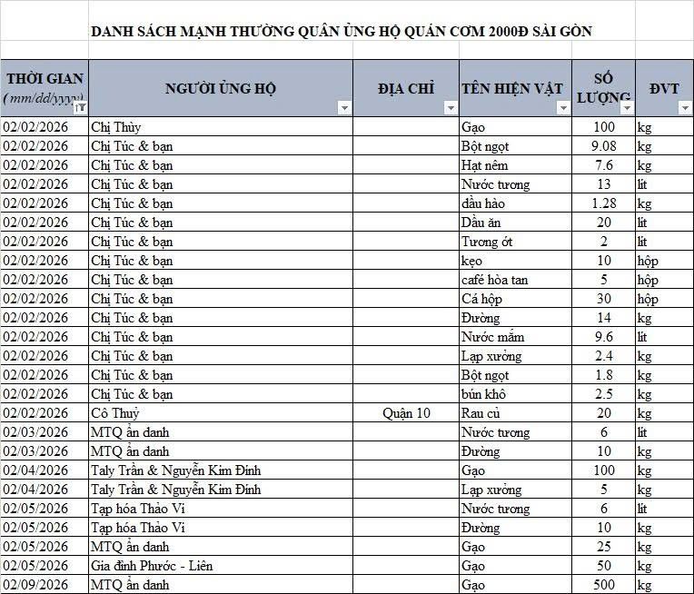 Cập nhật ủng hộ hiện vật của quán cơm trong thời gian qua.