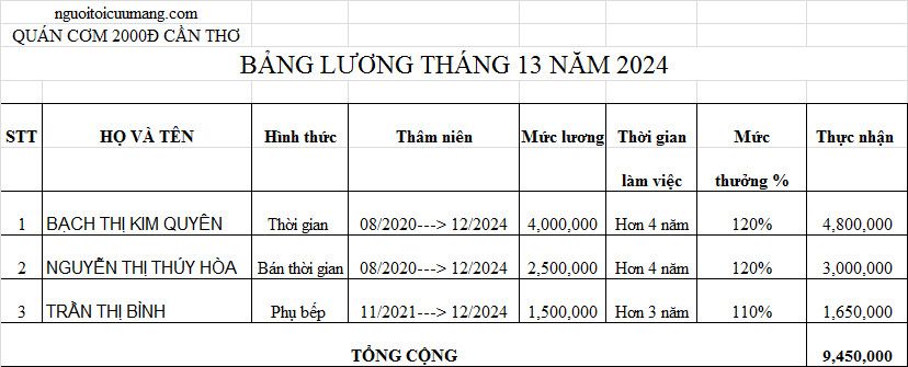 Chi phí quán cơm Cần Thơ từ ngày 17/12 đến 31/12/2024