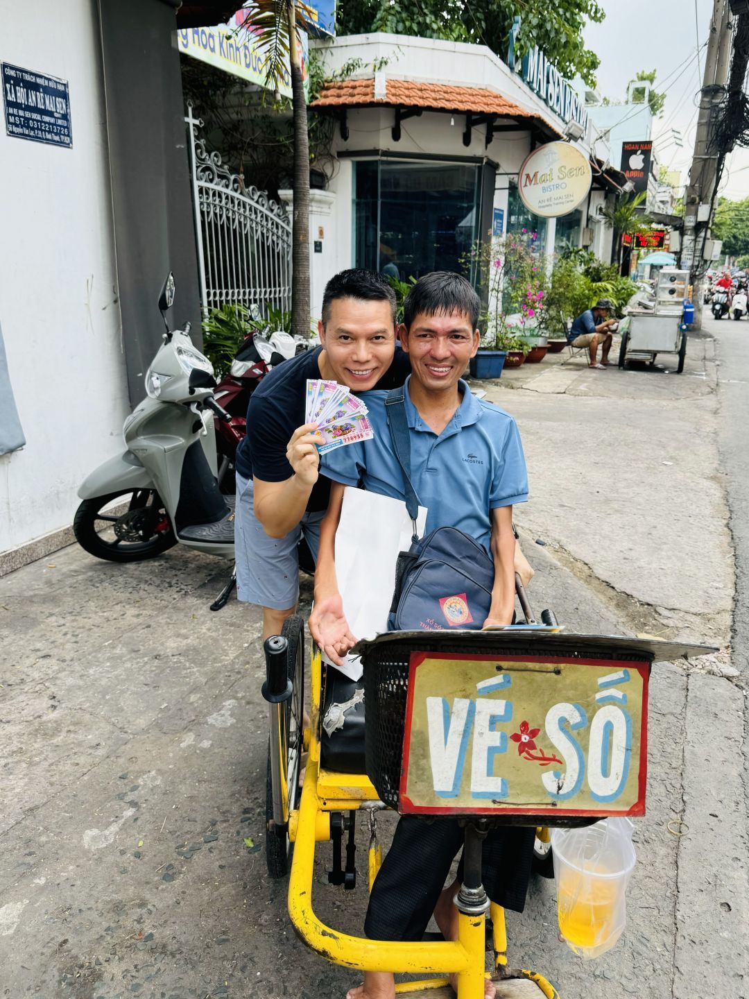 Và chiều nay, trong cái thời tiết oi bức giữa mưa và nắng, tôi tranh thủ ra nơi em hay đậu xe bán vé số lâu nay vào các buổi chiều (56 Nguyễn Văn Lạc, Bình Thạnh). Chú Quốc, người đàn ông mới nghỉ hưu ở nhà đối diện, gần như chiều nào cũng sang giúp em xếp vé, bán vé và nhận/thối tiền cũng như canh chừng kẻ gian (nếu có) cho em! Cứ vài phút lại có người ghé, trong đó rất nhiều khách quen của em, dừng lại mua 2 tờ, 5 tờ hoặc 10 tờ! Đứng cùng em và chú Quốc rồi nhìn dòng người qua lại, những tờ vé số được trao tay mà lòng mình vui mát lạ.