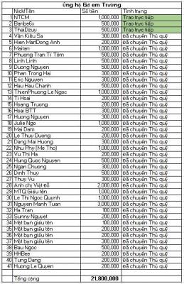 @Thocon : Em xuất quỹ chuyển tới bạn Kiều Xuân Trường Trường số tiền 20,600,000đ mà các bạn ủng hộ cho Trường dùm nhé.