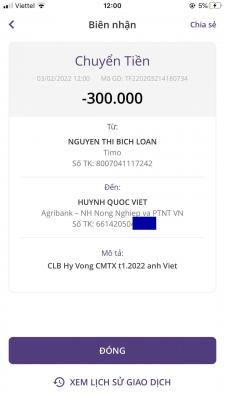 Loannguyen đã trung chuyển 300,000đ CMTX tháng 02/2022 từ CLB Hy Vọng đến TK anh Việt rồi ạ !