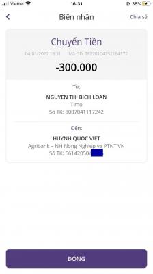 Loannguyen đã trung chuyển 300,000đ CMTX tháng 12/2021 từ CLB Hy Vọng đến TK anh Việt rồi ạ !