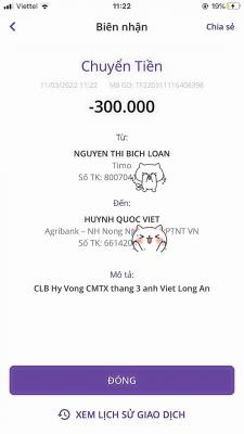Loannguyen đã trung chuyển 300,000đ CMTX tháng 02/2022 từ CLB Hy Vọng đến TK anh Việt rồi ạ !