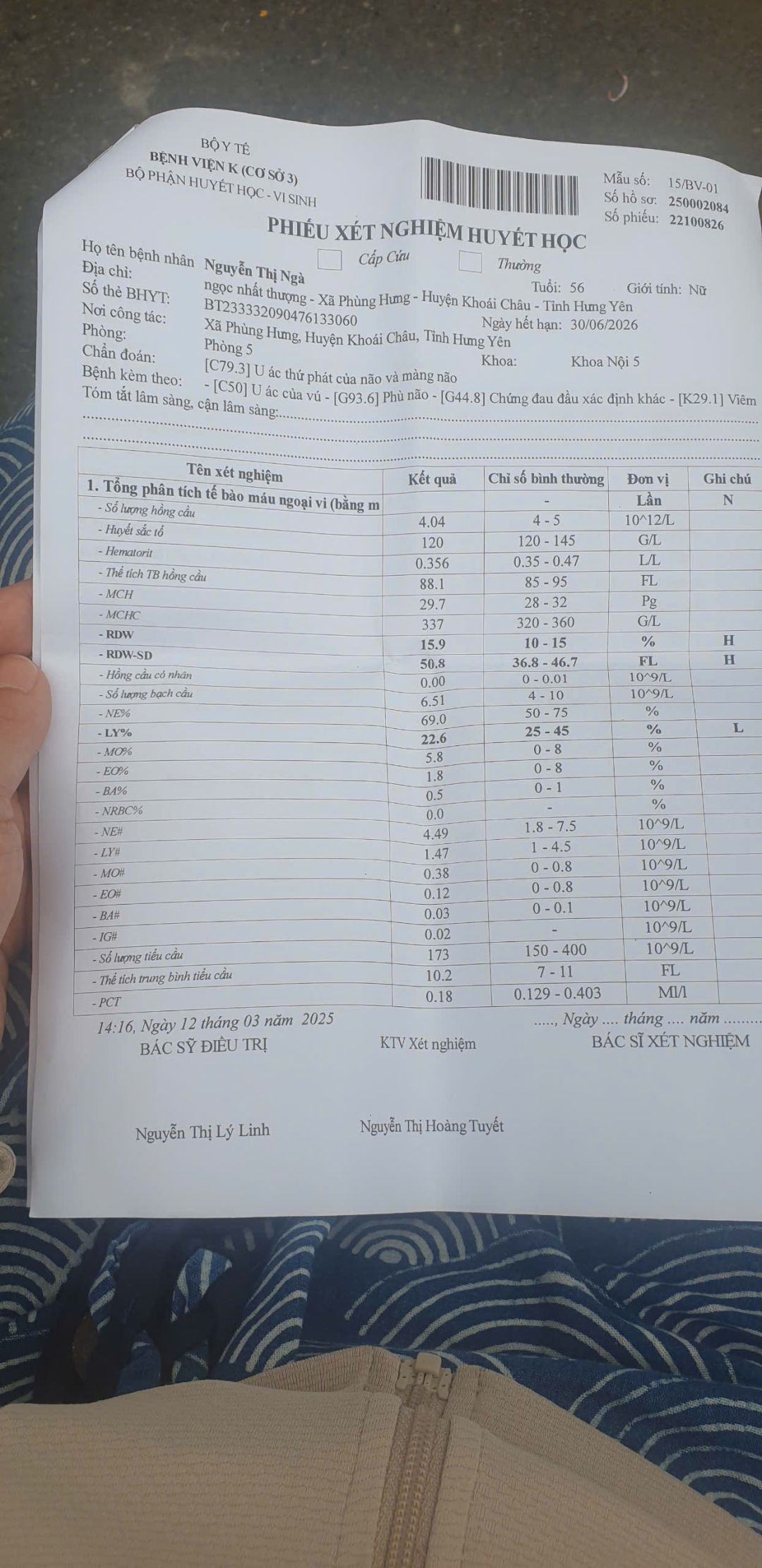 Do U ở đầu của chị Ngà sưng to và thường xuyên xảy ra tình trạng đau đầu, không ngủ được. Bác sĩ lo ngại xảy ra tình trạng tụ máu nên chuyển chị ý sang Bạch Mai. Nhưng sau khi thăm khám, chụp chiếu thì bên Bạch Mai họ không nhận mà chuyển lại về viện K. Chi phí điều trị tại Bạch Mai là 3tr8 do không được bảo hiểm, vừa đủ với số tiền quỹ đã hỗ trợ chị lần vừa rồi ạ. Theo lịch thì ngày 17/4 là lần điều trị tiếp theo của chị.