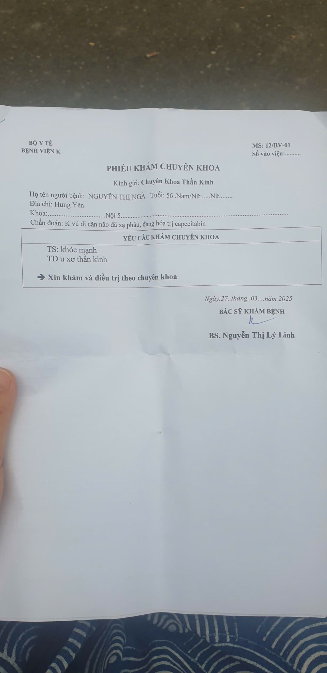 Do U ở đầu của chị Ngà sưng to và thường xuyên xảy ra tình trạng đau đầu, không ngủ được. Bác sĩ lo ngại xảy ra tình trạng tụ máu nên chuyển chị ý sang Bạch Mai. Nhưng sau khi thăm khám, chụp chiếu thì bên Bạch Mai họ không nhận mà chuyển lại về viện K. Chi phí điều trị tại Bạch Mai là 3tr8 do không được bảo hiểm, vừa đủ với số tiền quỹ đã hỗ trợ chị lần vừa rồi ạ. Theo lịch thì ngày 17/4 là lần điều trị tiếp theo của chị.