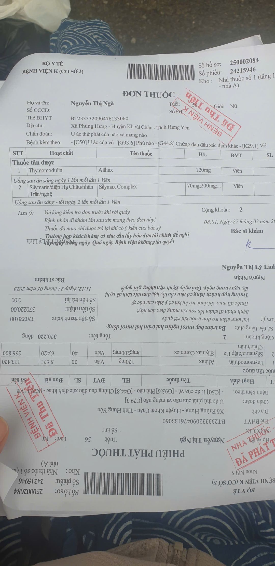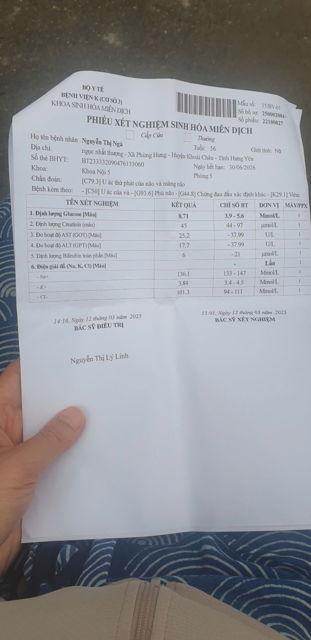 Do U ở đầu của chị Ngà sưng to và thường xuyên xảy ra tình trạng đau đầu, không ngủ được. Bác sĩ lo ngại xảy ra tình trạng tụ máu nên chuyển chị ý sang Bạch Mai. Nhưng sau khi thăm khám, chụp chiếu thì bên Bạch Mai họ không nhận mà chuyển lại về viện K. Chi phí điều trị tại Bạch Mai là 3tr8 do không được bảo hiểm, vừa đủ với số tiền quỹ đã hỗ trợ chị lần vừa rồi ạ. Theo lịch thì ngày 17/4 là lần điều trị tiếp theo của chị.