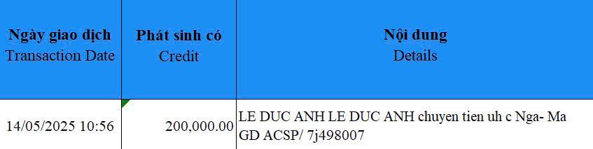 Hôm nay ngày 14/05/2025, chị Ngà sẽ ra điều trị đợt tiếp theo. Em sẽ ứng trước và xin nhận tiền chuyển khoản theo số tài khoản sau ạ: