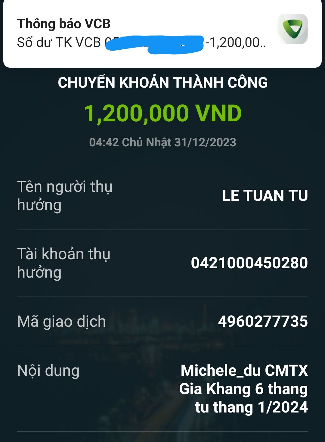 Đã chuyển 1,800,000đ cho @letuantu nhờ chuyển giúp cháu nhé.