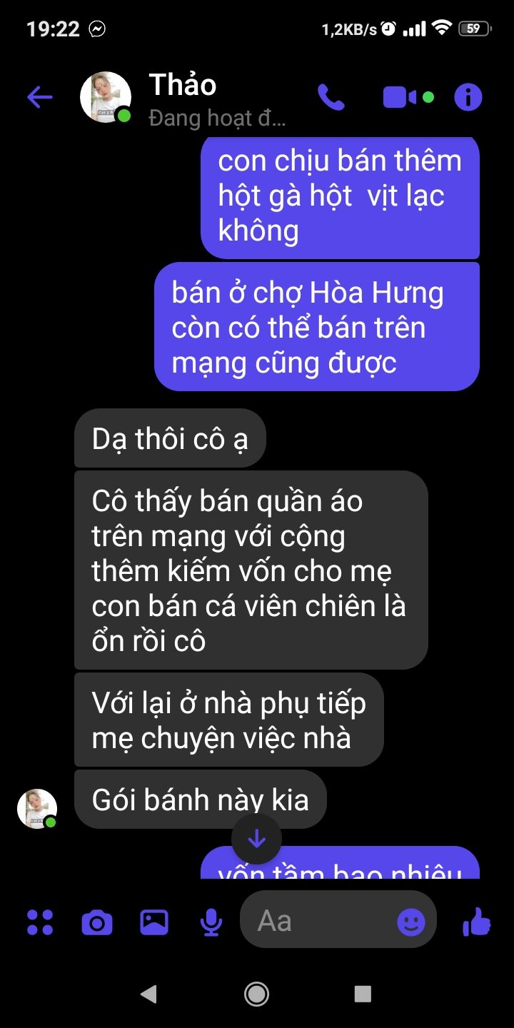 2/Mai Trâm có tham khảo ý kiến Ba Mẹ Thảo cùng Em Thảo về việc mua bán hay chăn nuôi heo gà vịt gì đó để cho cuộc sống gia đình cải thiện tốt hơn. em Thảo nói ba mẹ không có ý định chăm nuôi chỉ muốn mua bán và hiện tại em Thảo cũng đang mua bán quần áo online.