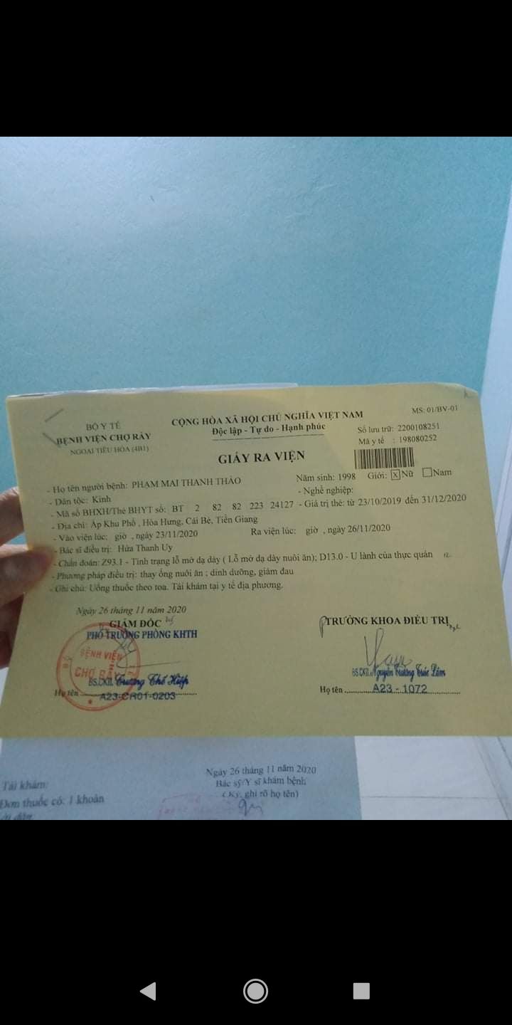 do ống dẫn thức ăn của em Thảo bị vỡ cộng hôm qua nay em không ăn gì em bị mệt nên lúc 15h15p chiều ngày 23/11/2020 bệnh viện Mỹ Tho đã đưa em bằng xe cấp cứu lên bệnh viện chợ rẫy để can thiệp.và hiện tại em đang nằm tại phòng cấp cứu tại bệnh viện chợ rẫy.tình hình hiện tại em ấy cũng đã ổn.Mẹ Em nói là bác sĩ bảo khi nào sức khỏe ổn thì tối nay sẻ thay ống dẫn thức ăn cho em luôn.