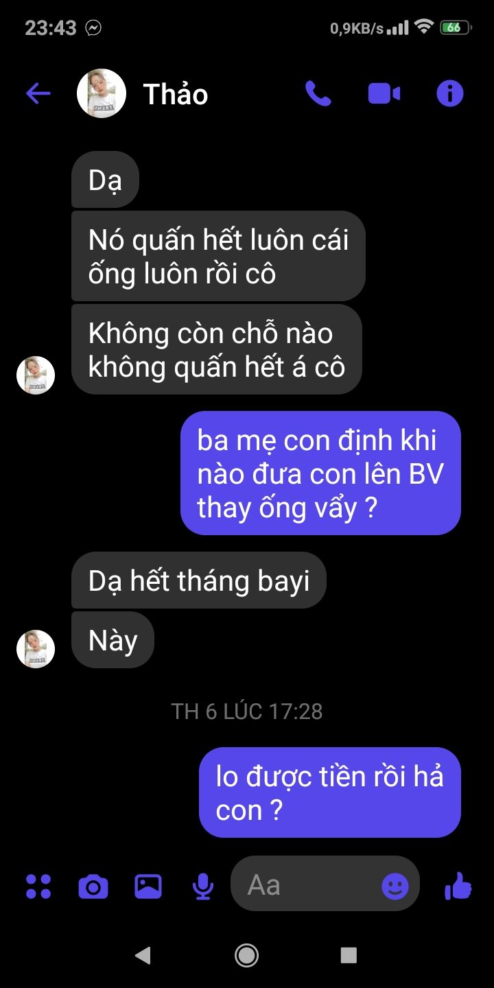 hôm thứ sáu vừa rồi Mai Trâm có nhận điện thoại trên messenger của em Thảo nhờ Mai Trâm tìm việc làm giúp để em có tiền phụ gia đình đưa Em đi lên bệnh viện chợ rẫy thay ống dẫn thức ăn gì hiện tại ống dẫn thức ăn của em đã bị vỡ gần 1 tháng nay. em tâm sự với Mai Trâm thấy mẹ đi vay tiền cho em hai ống. nên em muốn có công việc nào làm được có tiền để giúp gia đình.