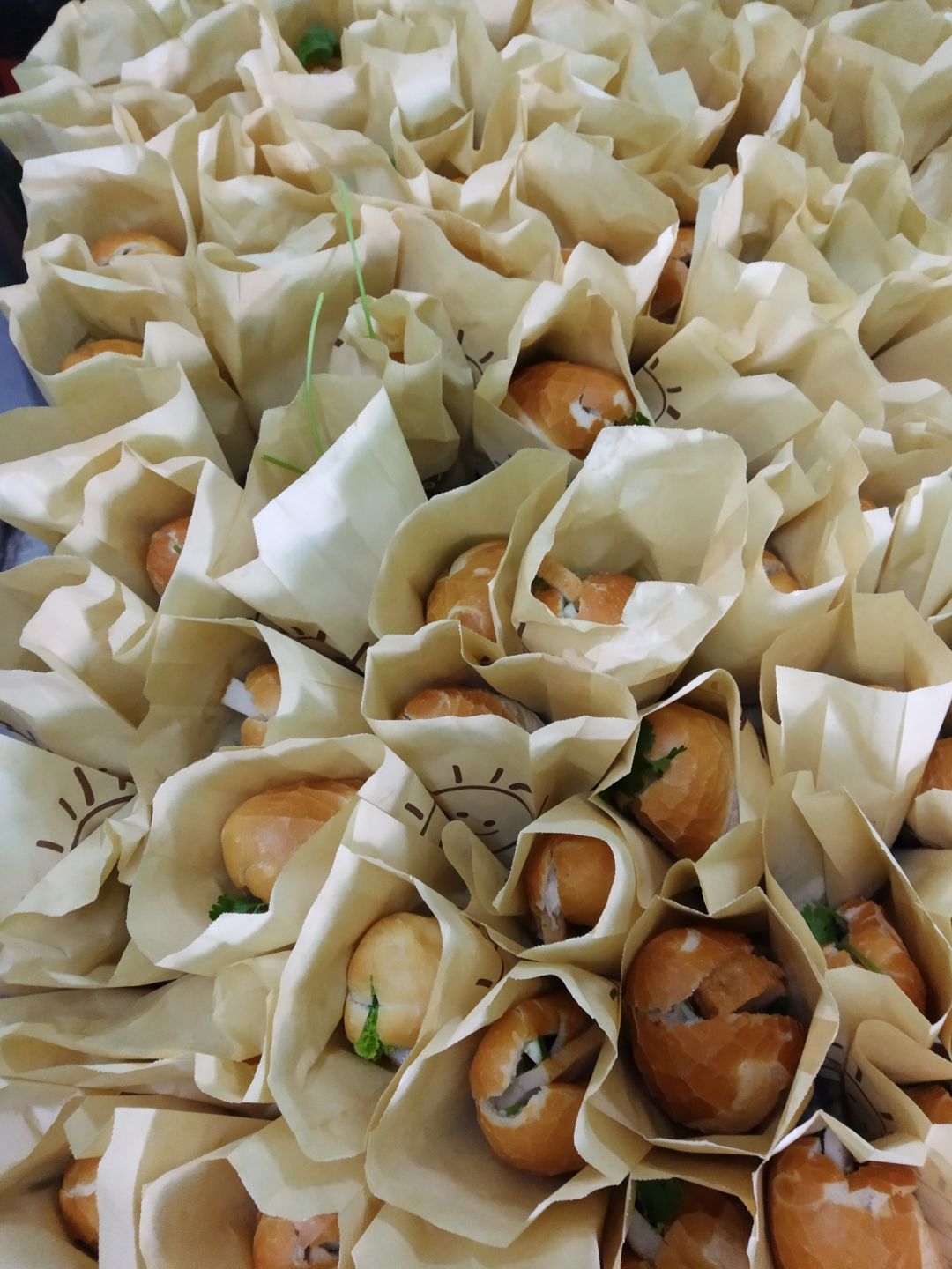 Hôm nay chúng ta bán bánh mì chả cá + chuối + bắp rang.
