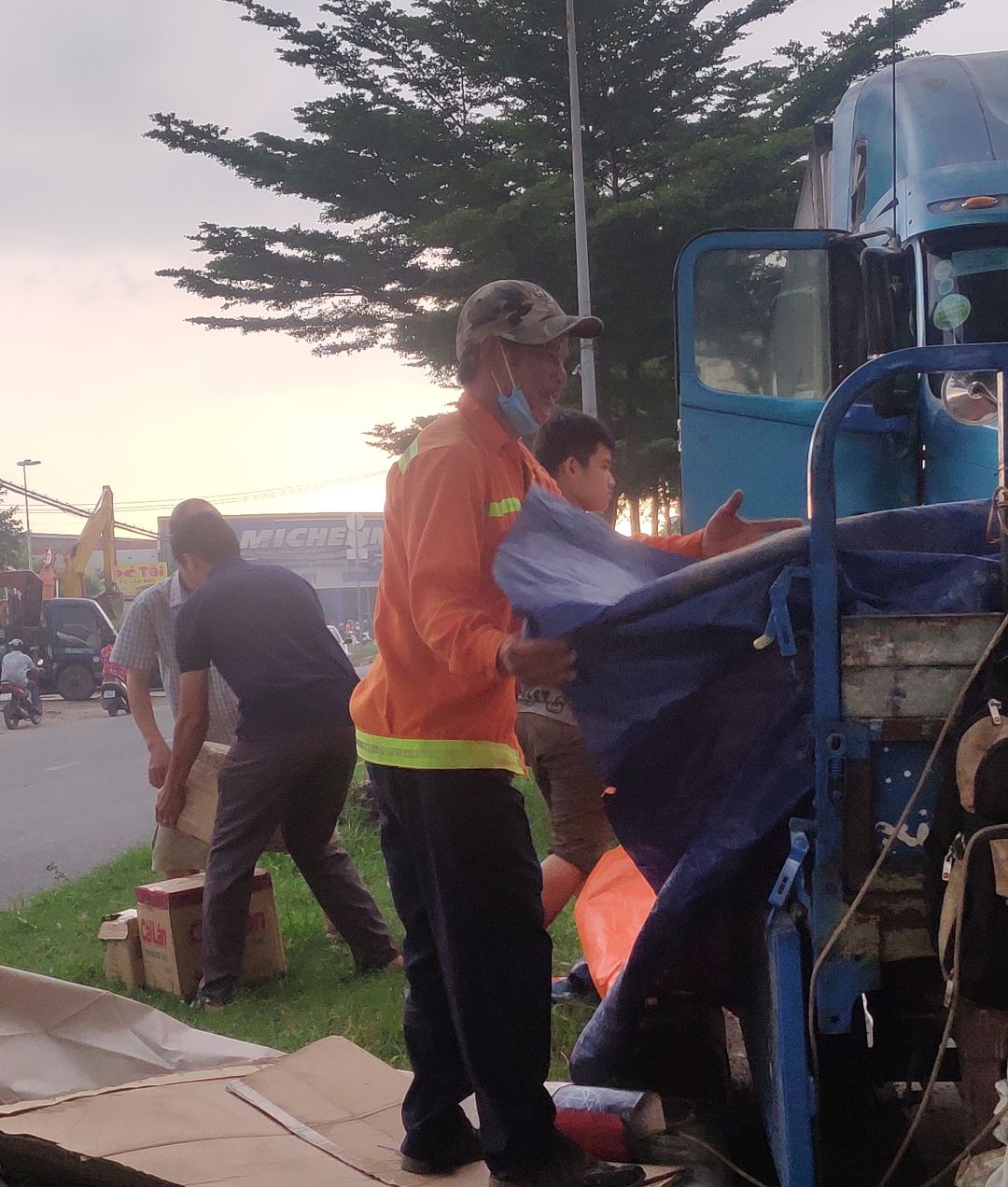 Mai Trâm xin gửi thêm hình ảnh anh em cùng cha con Hoàng Linh Bê gạo lên xe.