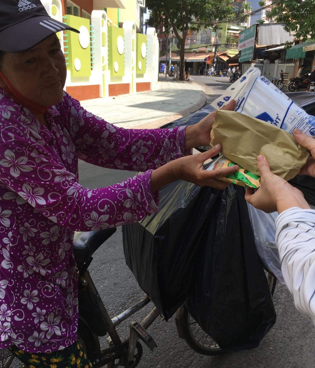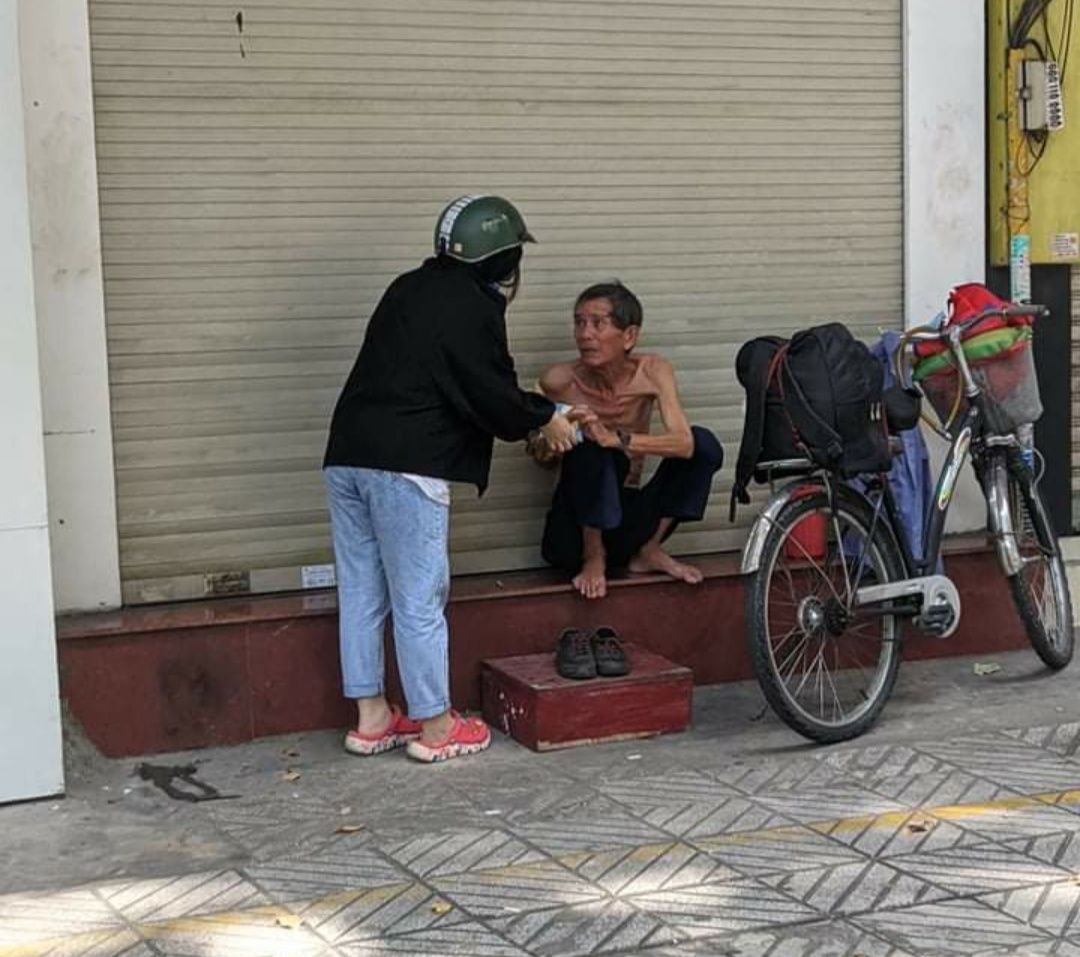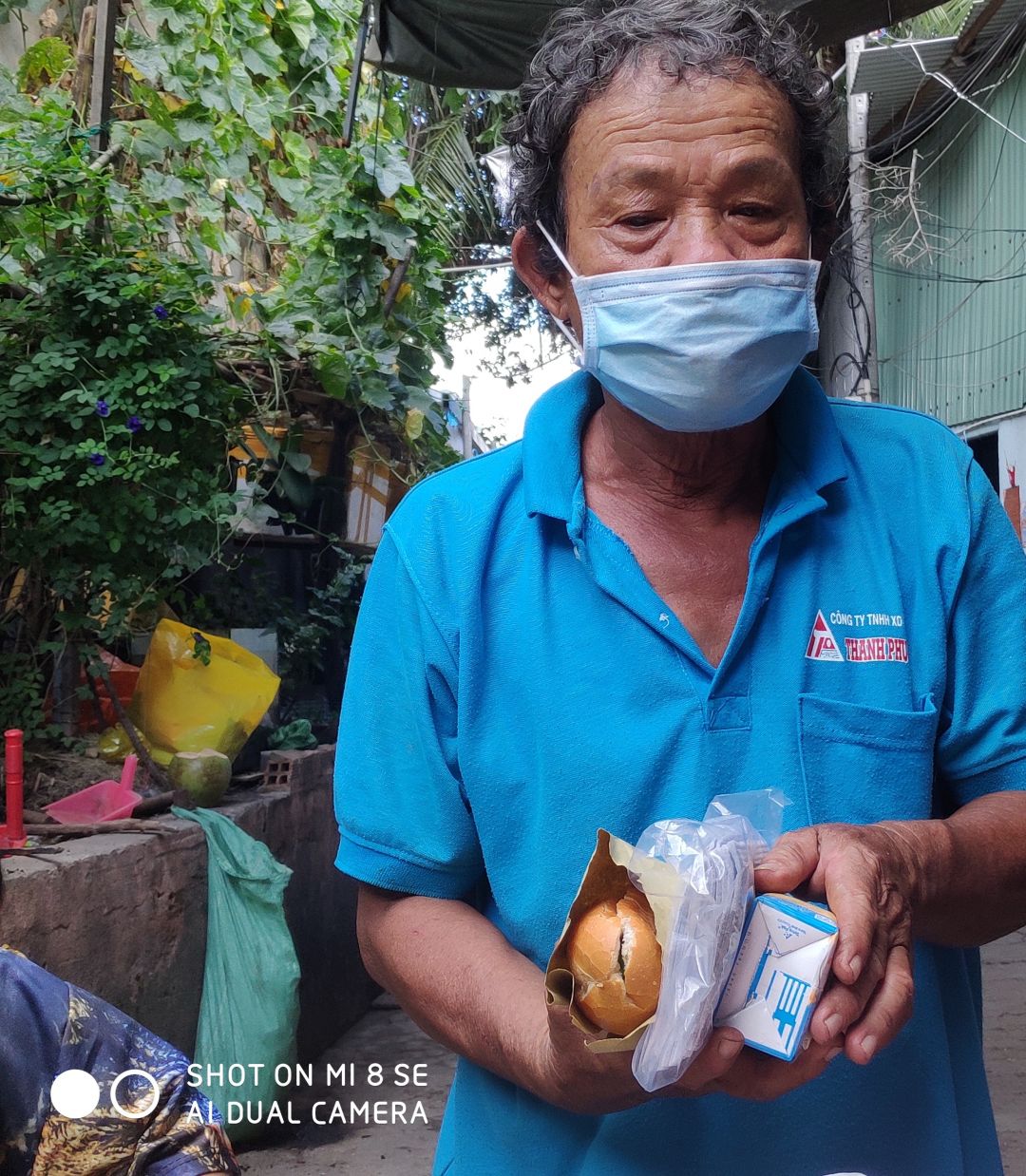 Hình ảnh Mai Trâm đi phát bánh mì+sữa đậu nành+khẩu trang y tế. tại xóm trọ nhiều người bán vé số,làm nghề ve chai nơi Mai Trâm cư trú.