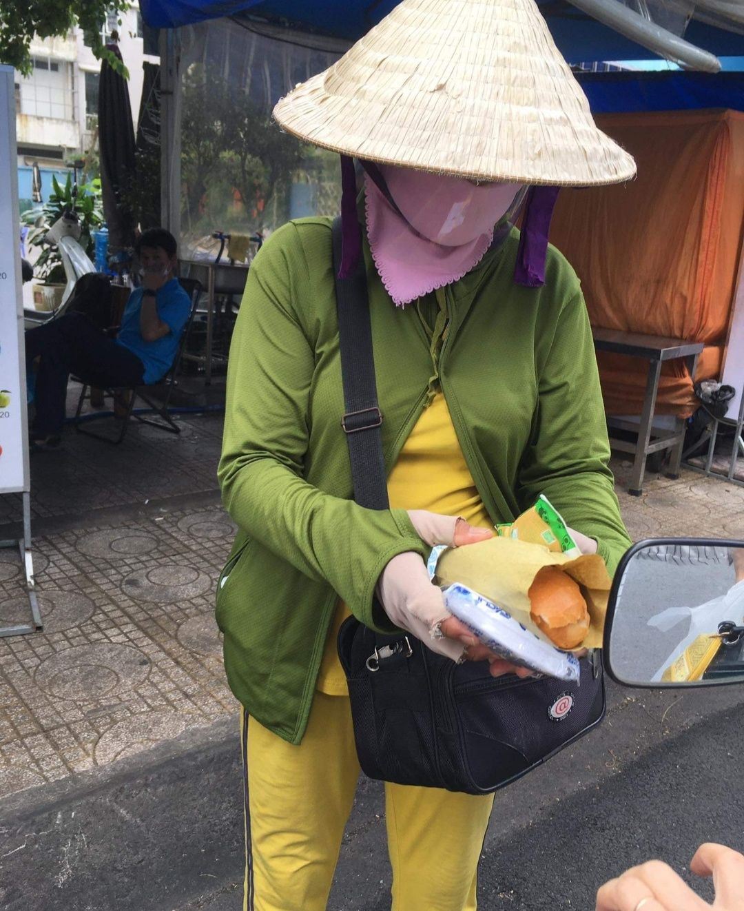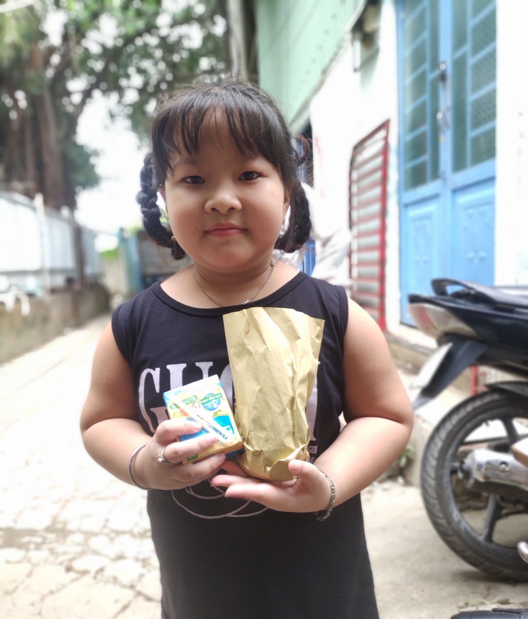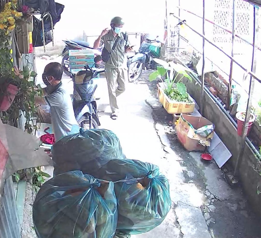 Hình ảnh Mai Trâm đi phát bánh mì+sữa đậu nành+khẩu trang y tế. tại xóm trọ nhiều người bán vé số,làm nghề ve chai nơi Mai Trâm cư trú.