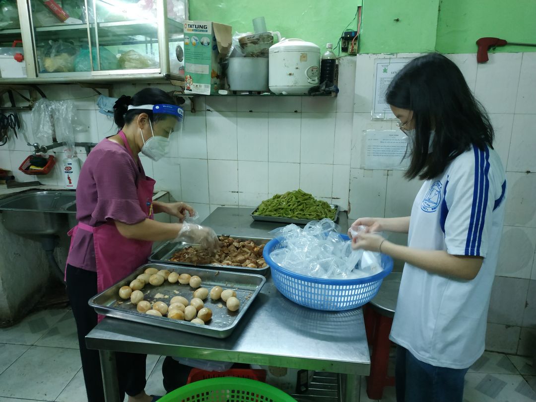Hôm nay, quán cơm 2000đ SG đặt cơm chiên dương châu để phát cho bà con, nguyên liệu quán cơm đưa đi nấu gồm 31kg gạo, 14kg chả cá, hộp, muỗng và bao bì, các nguyên liệu còn lại cũng như công nấu mỗi phần là 10,000đ. Tổng 300 phần cơm là 3,000,000đ.