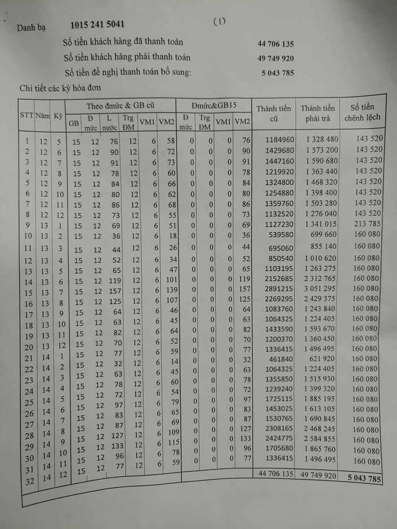 Ngoài khoản tiền đã đóng hàng tháng, giờ phải trả thêm khoản chênh lệch phát sinh ( theo bảng đính kèm bên dưới), tổng cộng là 19,497,928đ.
