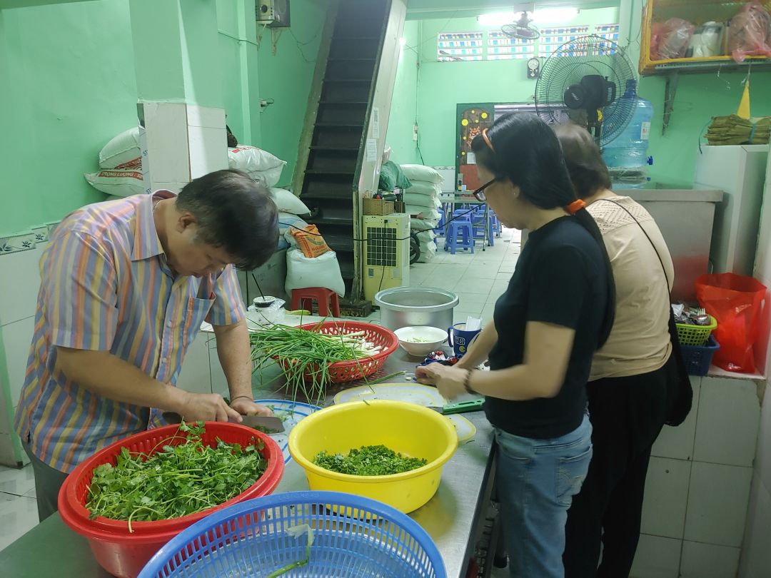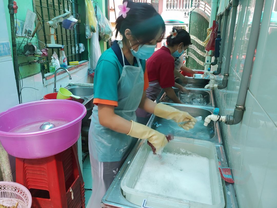 May nhờ có các cô đến hỗ trợ thường xuyên, nhóm bạn của anh Hùng, và các anh chị thực khách sẵn lòng vào cùng hỗ trợ dọn rửa nên công việc vẫn hoạt động trôi chảy.