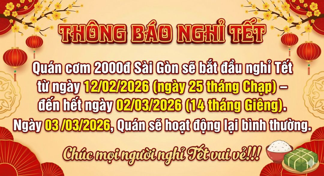 Quán cơm 2000đ Sài Gòn sẽ bắt đầu nghỉ Tết từ ngày 12/02/2026 (ngày 25 tháng Chạp) – đến hết ngày 02/03/2026 (14 tháng Giêng).