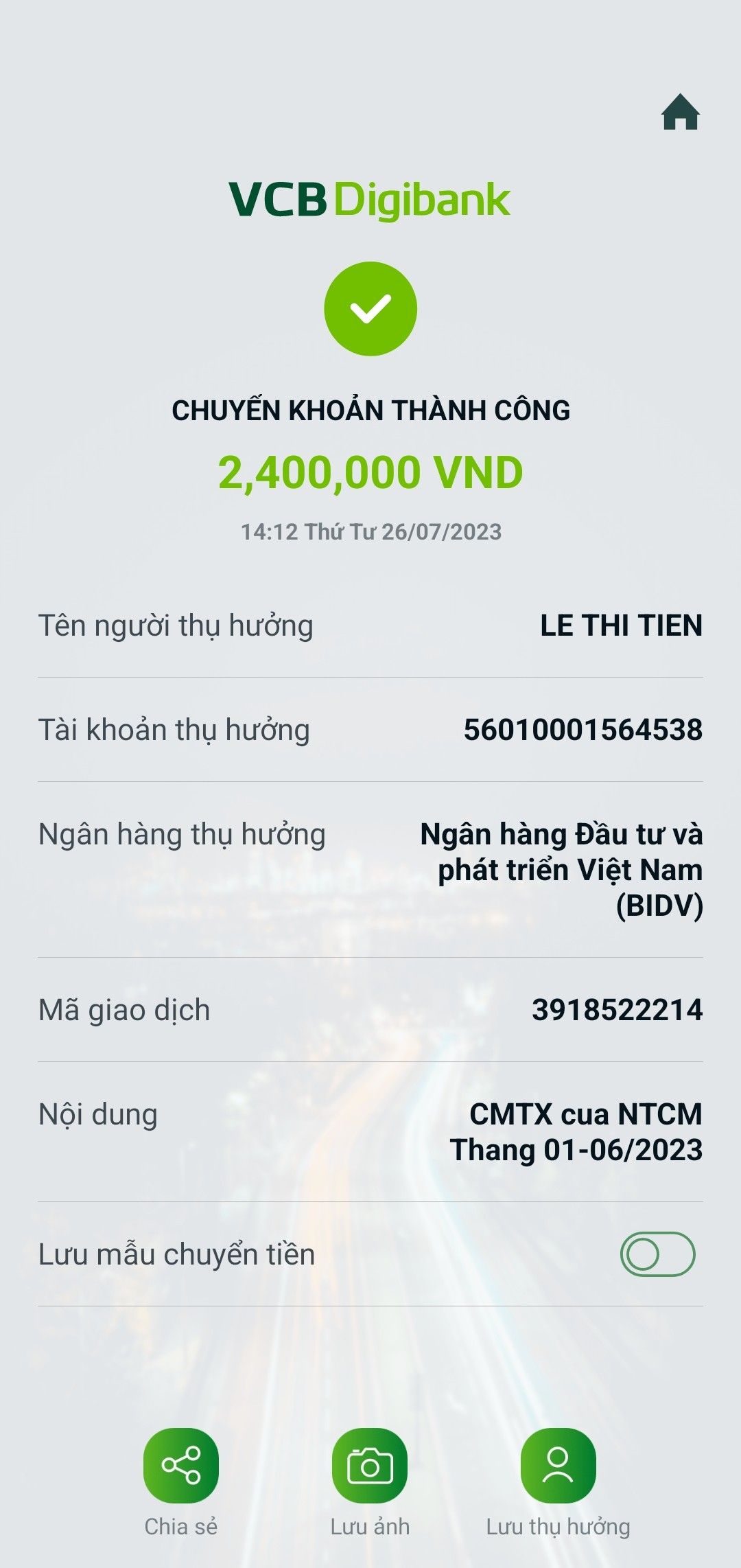 Hôm nay, ngày 26/7/2023. Em đã thay mặt MTQ chuyển khoản CMTX cho cháu từ tháng 01/2023 đến tháng 6/2023 (06 tháng) với số tiền 2.400.000đ (400.000đ/ 1 tháng) vào tài khoản của cháu. Từ nay mỗi tháng e sẽ chuyển khoản CMTX cho cháu đầy đủ vào cuối tháng. Em đã nhận được CMTX tháng 7/2023 từ a PHAM TRƯỜNG SƠN _ Viethuong ạ.