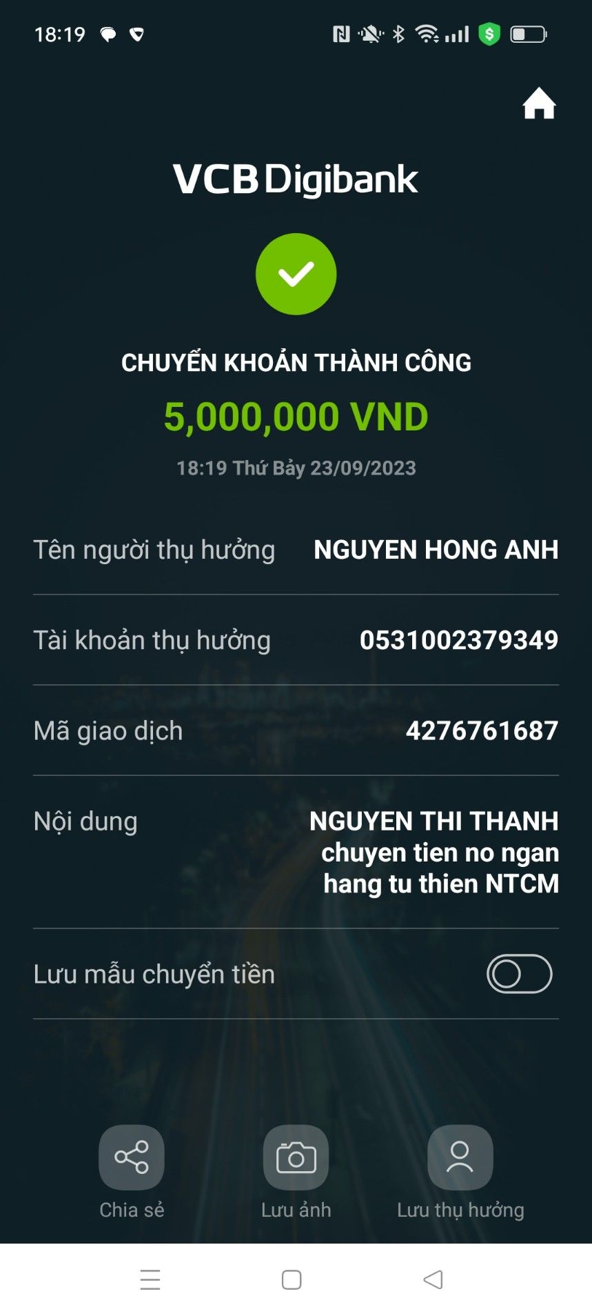 Michele_du và Gia đình sẽ chuyển toàn bộ khoản tiền 5,000,000đ mà chị Nga hoàn trả qua cho bạn Hoaithuong_xn vay các bạn nhé !