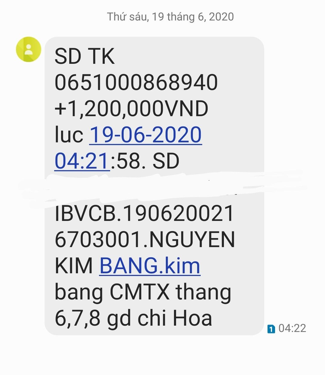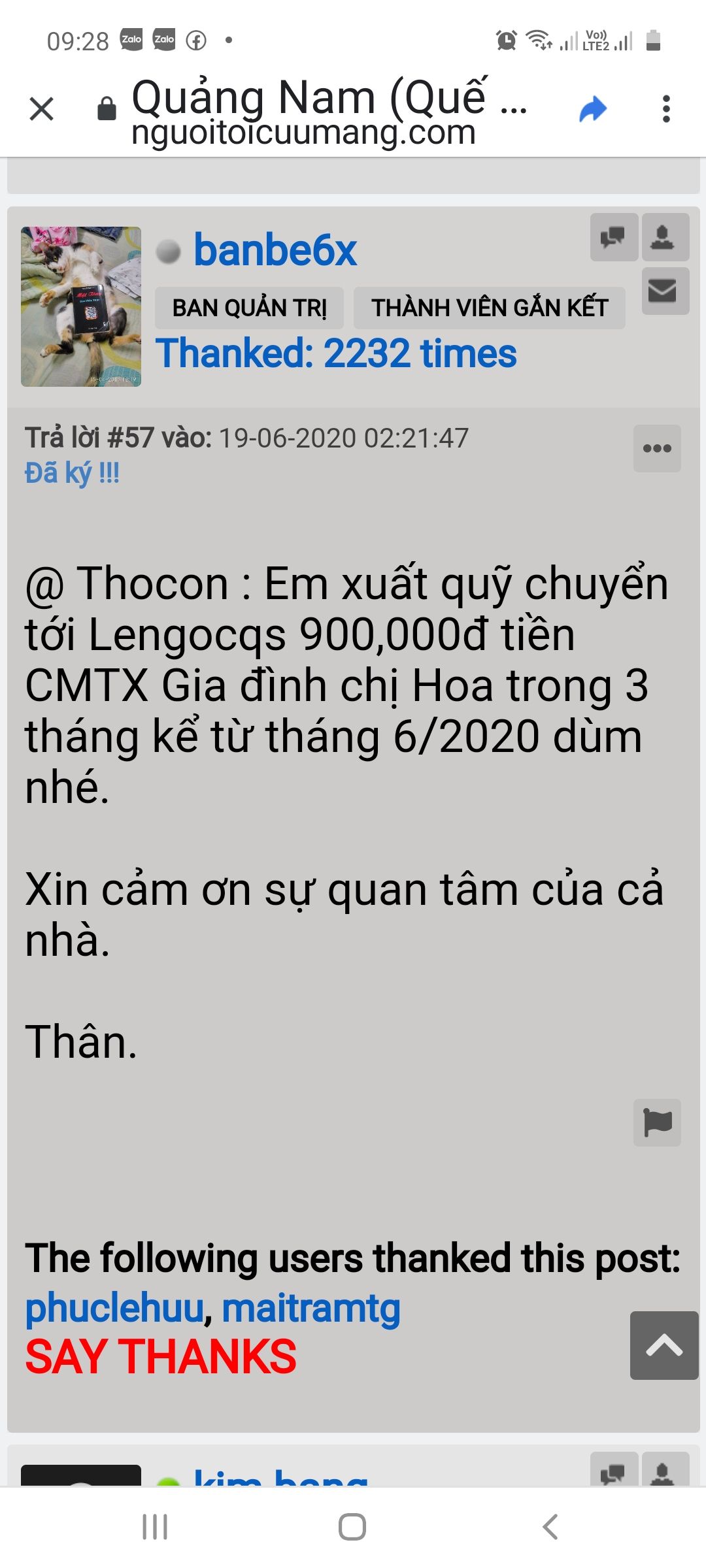 @ Lengocqs: Mình đã chuyển vào tk của bạn 1,2 triệu tiền CMTX gia đình chị Hoa. Nhờ bạn trung chuyển dùm. Xin cảm ơn!