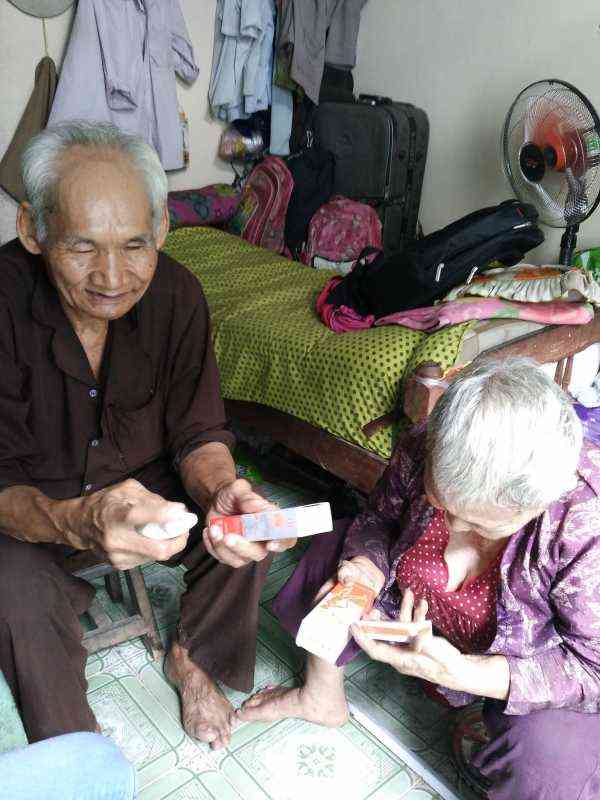 Hai ông bà khỏe, nhưng không tránh khỏi những cơn đau nhức của tuổi già khi trái gió trở trời. Ông bảo nhờ có chai dầu xanh của c LePhung cho, tay chân ông bớt đau hơn, dầu xanh này có tác dụng tốt hơn dầu hôi hồi trước ông dùng nhiều. Còn bà thì do bị cao huyết á( tăng xông), ngồi dậy là thấy chóng mặt nên chỉ nằm và không ngồi được nhiều. Hy vọng với số thuốc được gửi, có thể giúp bà bớt chóng mặt, và khỏe hơn.