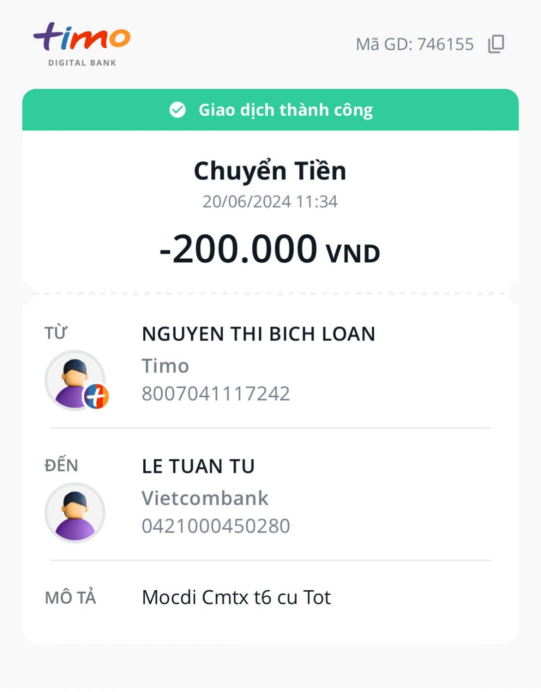Mộc Di xin tăng mức CMTX cho cụ Tốt lên 300,000đ/ tháng từ tháng 06 đến hết năm 2024 nhé. Đã chuyển tiền tháng 6 - 200,000đ cho @letuantu rồi nhé