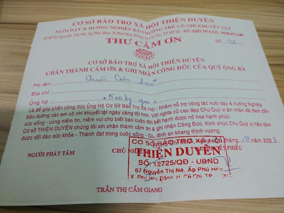 Quán cơm 2000đ SG sẽ hỗ trợ 500kg gạo cho mái ấm Thiện Duyên, hỗ trợ phần nào bữa ăn cho mọi người ở đó.
