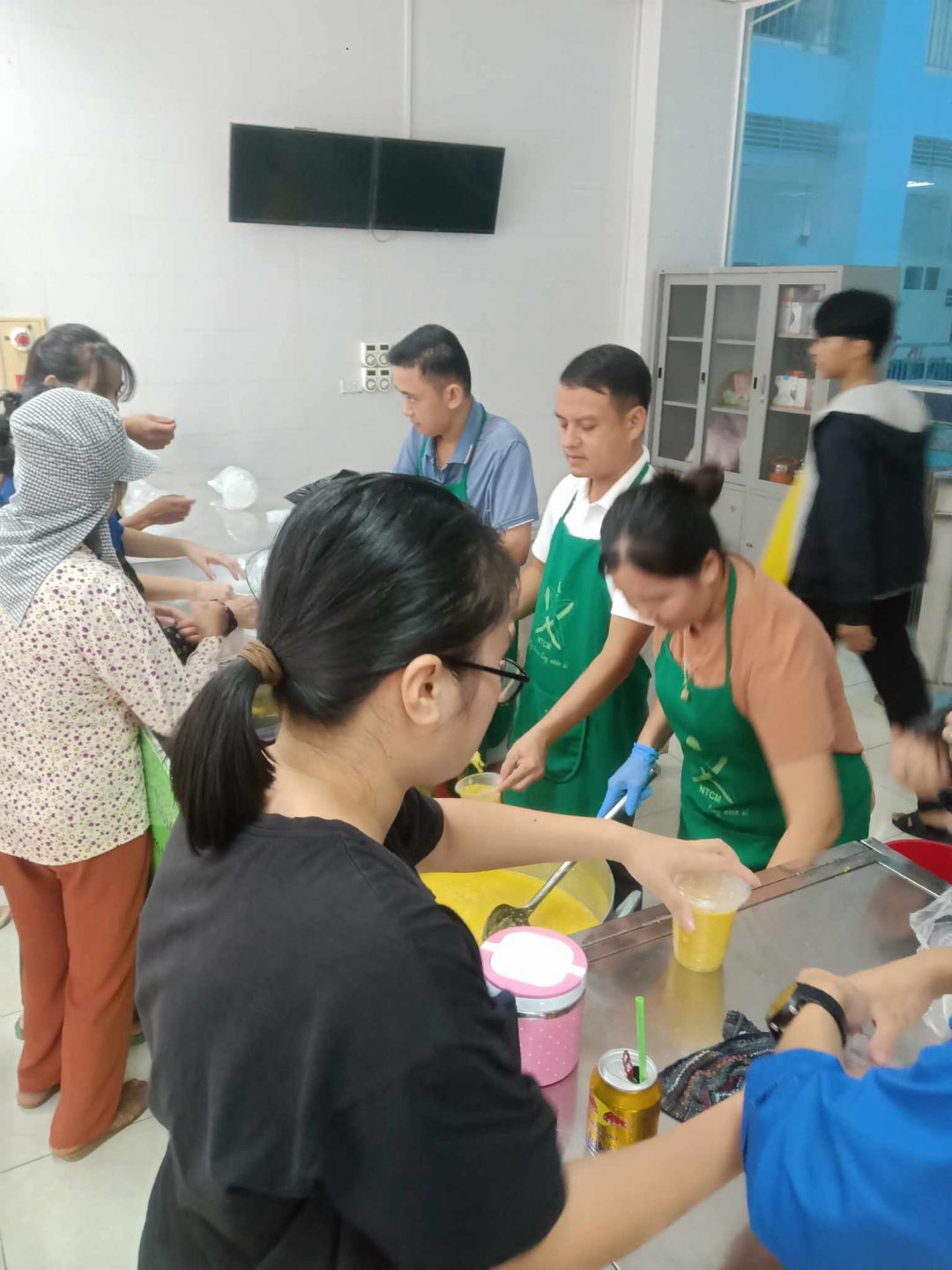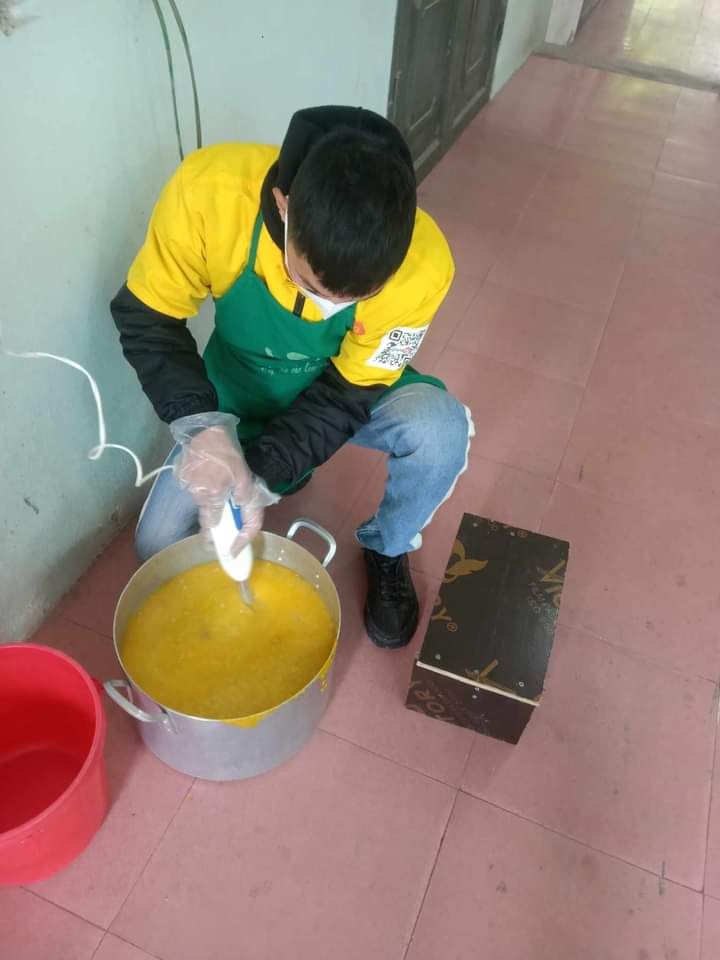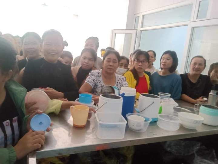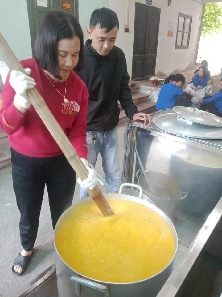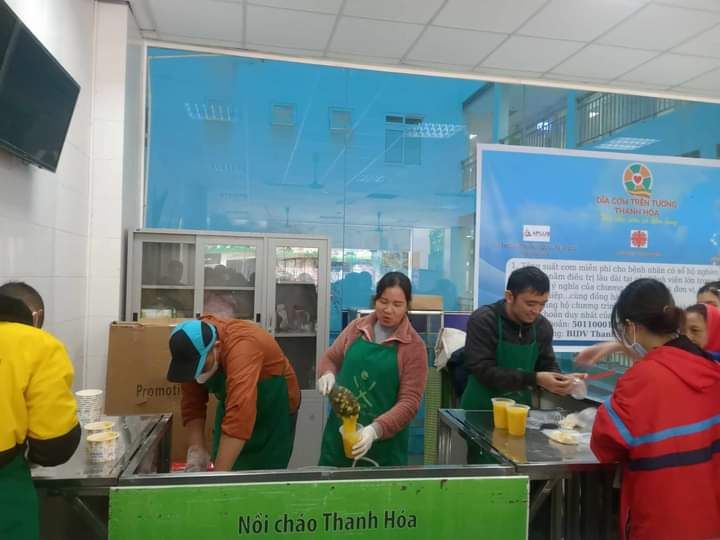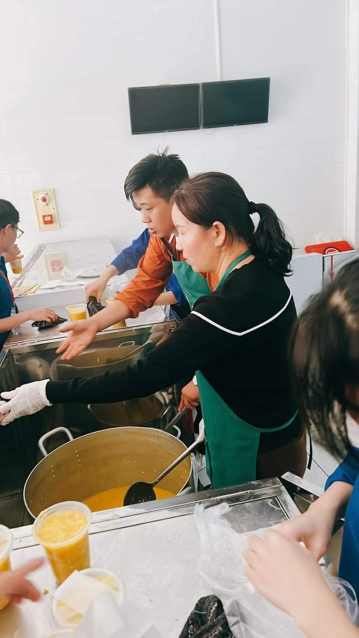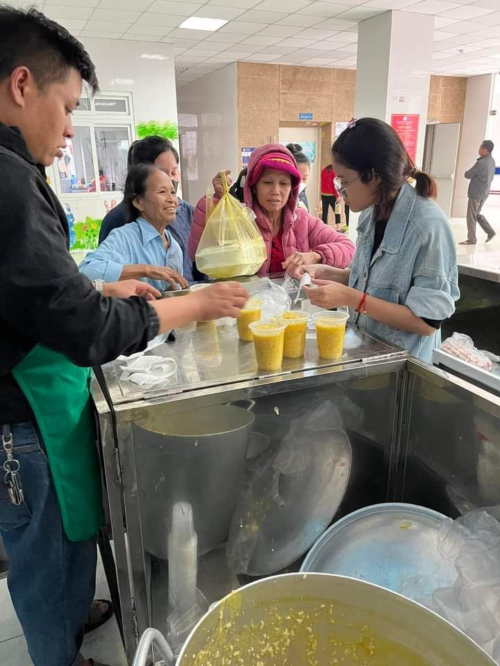 Hai cô tấm Duong Le và Hiền Bùi cùng 6 bạn SV Phân hiệu ĐHY đã hoàn thành công việc hơn cả mong đợi. Cháo ngon, sánh, dẻo thơm và không bị dính nồi… Bệnh nhân lấy cháo xếp hàng quy củ, những ai không mang theo hộp đựng sẽ có các cốc giấy được MTQ tài trợ lâu nay.