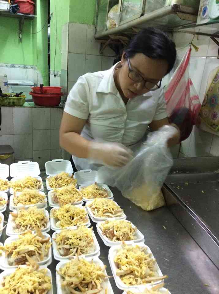 Đùi gà chiên của buổi sáng bán cơm được chiên lại cho nóng, giòn rụm cho từng hộp xôi.