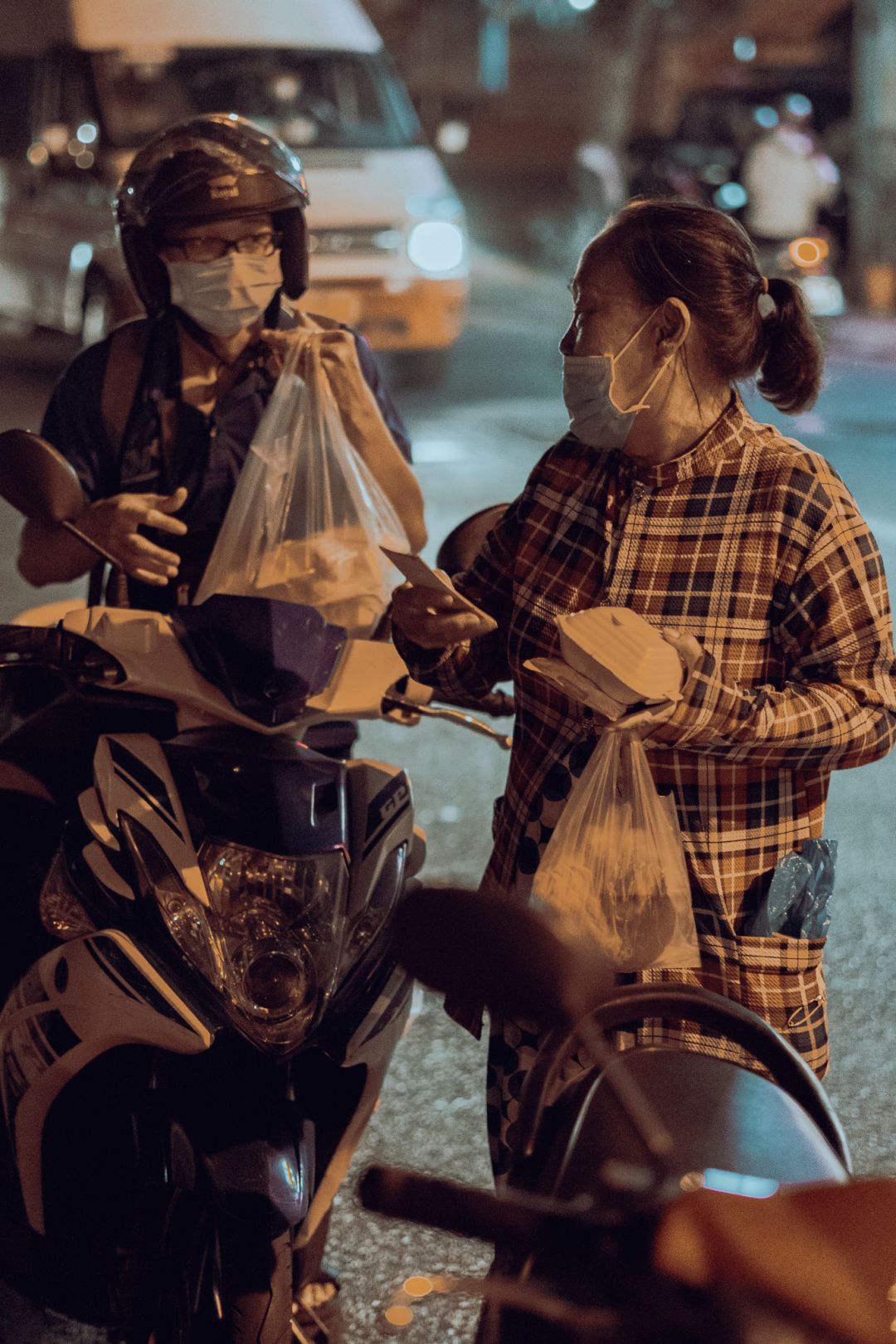 Gửi cả nhà một số hình ảnh hoạt động làm & phát xôi tối hôm nay. Tuy trời mưa nhưng mọi người vẫn hăm hở mang những phần xôi kèm hộp sữa đậu nành, trao cho bà con đang vất vả mưu sinh trên đường.