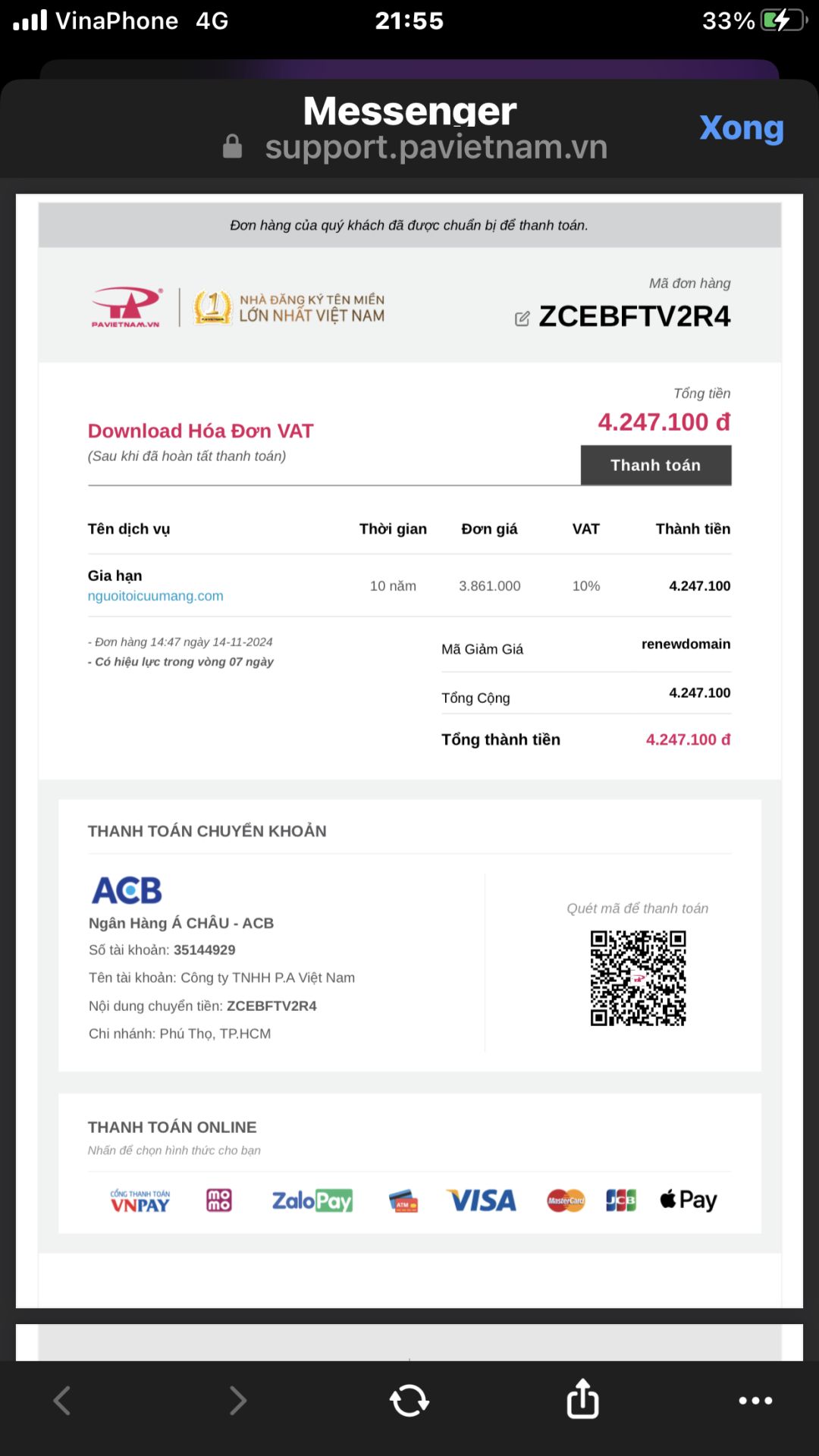 @trangvitgioi : Em xuất quỹ NTCM chuyển cho PA VN 4,300,000₫ để đóng phí duy trì quyền sở hữu tên miền trong 19 năm tiếp theo dùm nhé.