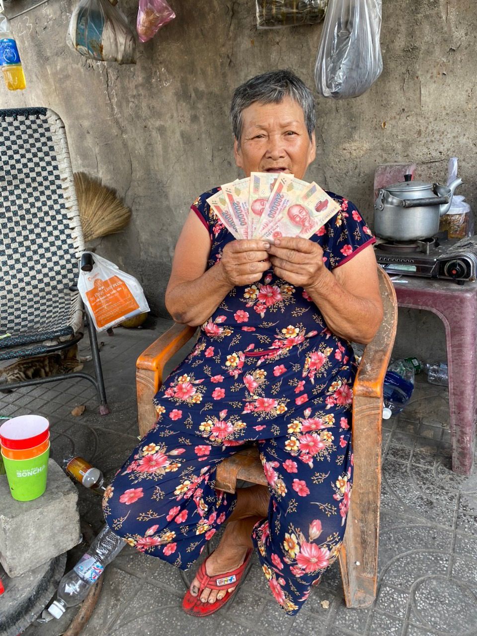 Vừa rồi đợt dịch phải nghỉ cấm bán hàng nên bà cũng không có thu nhập gì thêm, bà cho biết may có mấy cô chú từ thiện có đến phát gạo và thực phẩm nên ba bà cháu cũng không đến nỗi, giờ đi vào ổn định rồi thì bà có mở lại quán nước nhưng vắng vẻ hơn trước. Bé lớn thì vẫn phụ cty vận tải bên đối diện và hàng ngày họ cho cơm ba bà cháu buổi trưa cộng thêm cho bé chút đỉnh tiền tiêu vặt chứ không được nhiều. Bé nhỏ thì ở nhà phụ bà bán nước.