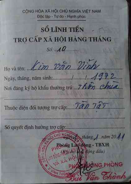 Theo như anh Vĩnh Cho biết anh ko có  giấy chứng nhận người khuyết tật nào từ trước đến giờ,mà chỉ có BHYT dành khuyết tật,và mỗi tháng anh dc hưởng 517k/tháng.