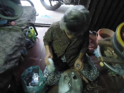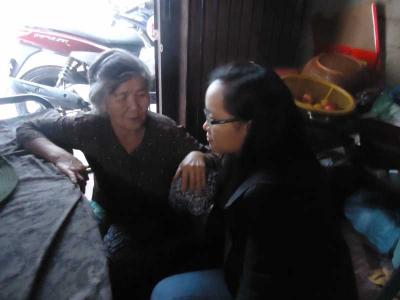 Rất may mắn là tới nhà lần này được gặp đầy đủ cả hai cụ, bà thì đang ngồi trước cửa đếm mấy đồng bạc lẻ vừa bán khoai lang lúc sáng và chuẩn bị đi ra chợ đầu mối để lấy khoai về bán cho ngày hôm sau. Được biết hai ông bà là hai vợ chồng chứ không phải hai anh em (lần trước thì được nghe thông tin hai cụ là anh em), bà tên Ngô Thoại Phương năm nay đã 73t còn ông thì 82t. Sau một lần bị tai nạn thì đôi chân của ông đau đi đứng rất khó khăn nên chỉ đi khập khiễng trong nhà. Còn bà thì 3g sáng hằng ngày đã dậy nấu khoai bưng ra đầu hẻm để bán. Mỗi ngày, bà chỉ bán 3kg khoai và tiền lời khoảng 20.000đ, với đồng tiền ít ỏi nên bà thường mua 2 hộp cơm chay với giá 10.000đ để hai ông bà ăn cả ngày. Căn nhà tối om vì bà bảo chỉ dám dùng đèn dầu chứ ít khi sử dụng điện vì sợ không có tiền trả. Tiền điện hằng tháng là 12.500đ và tiền nước là 12.190đ. Gặp hai chị em, ông bà nói chuyện rất vui vẻ nhưng khi kể về cuộc đời mình thì mắt bà như chực khóc. Hai ông bà có một người con gái nuôi đã ngoài 40t lấy chồng Đài Loan đến nay đã được mười năm nhưng cô lại không về thăm, cũng không gửi tiền chăm lo ông bà cụ lúc tuổi già. Bà còn có một người mẹ nuôi cũng đã hơn 90t nhưng bà cụ đã về Bến Tre ở. Cô bác hàng xóm thấy thương hoàn cảnh của ông bà nên thường cho ông bà mì gói, đường và một số đồ ăn khác. Bà cụ vì lớn tuổi, đau nhức người nên thường đi châm cứu và được phát thuốc miễn phí ở một phòng khám từ thiện (92 Cao Thắng, P.4, Q.3).