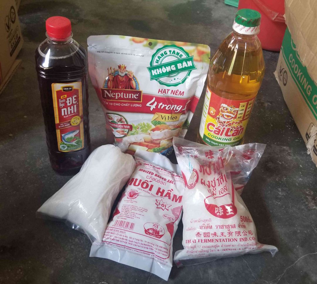2. Nhu yếu phẩm: 10 phần ( Trong đó: 1 phần gồm: dầu ăn 1 lít; nước mắm 1 lít, đường 1kg, bột ngọt 0,5kg; bột nêm 0,3kg, muối).