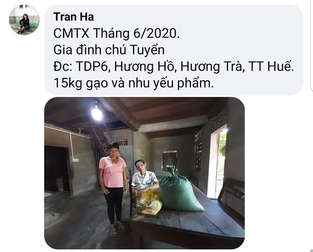 Qua các bài đề xuất cưu mang hàng tháng, thay mặt nhóm NTCM _ Huế em xin nhận trung chuyển lương thực và nhu yếu phẩm đến với các hộ đề xuất. Và số tiền cưu mang xin được chuyển về tài khoản thành viên Khanh Ly.