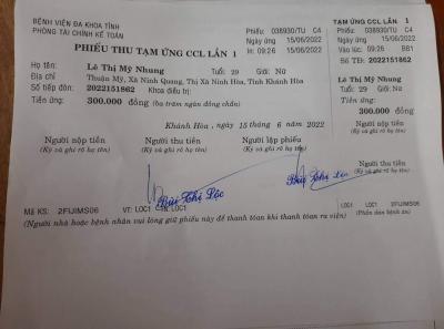 Hôm qua, Nhung đã hết tiền nên letuantu tạm ứng đưa trước 3,000,000đ để Nhung đóng thêm chi phí điều trị.