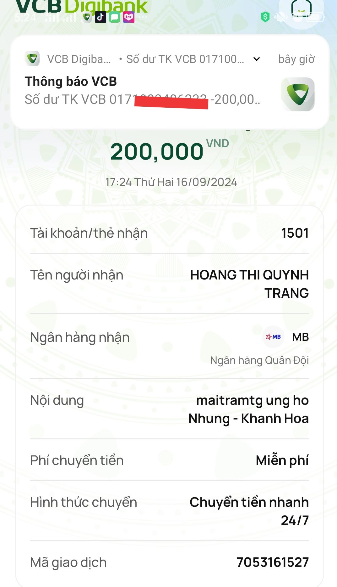Mai Trâm ủng hộ Nhung ở khánh Hòa một chút ( 200,000₫ ).
