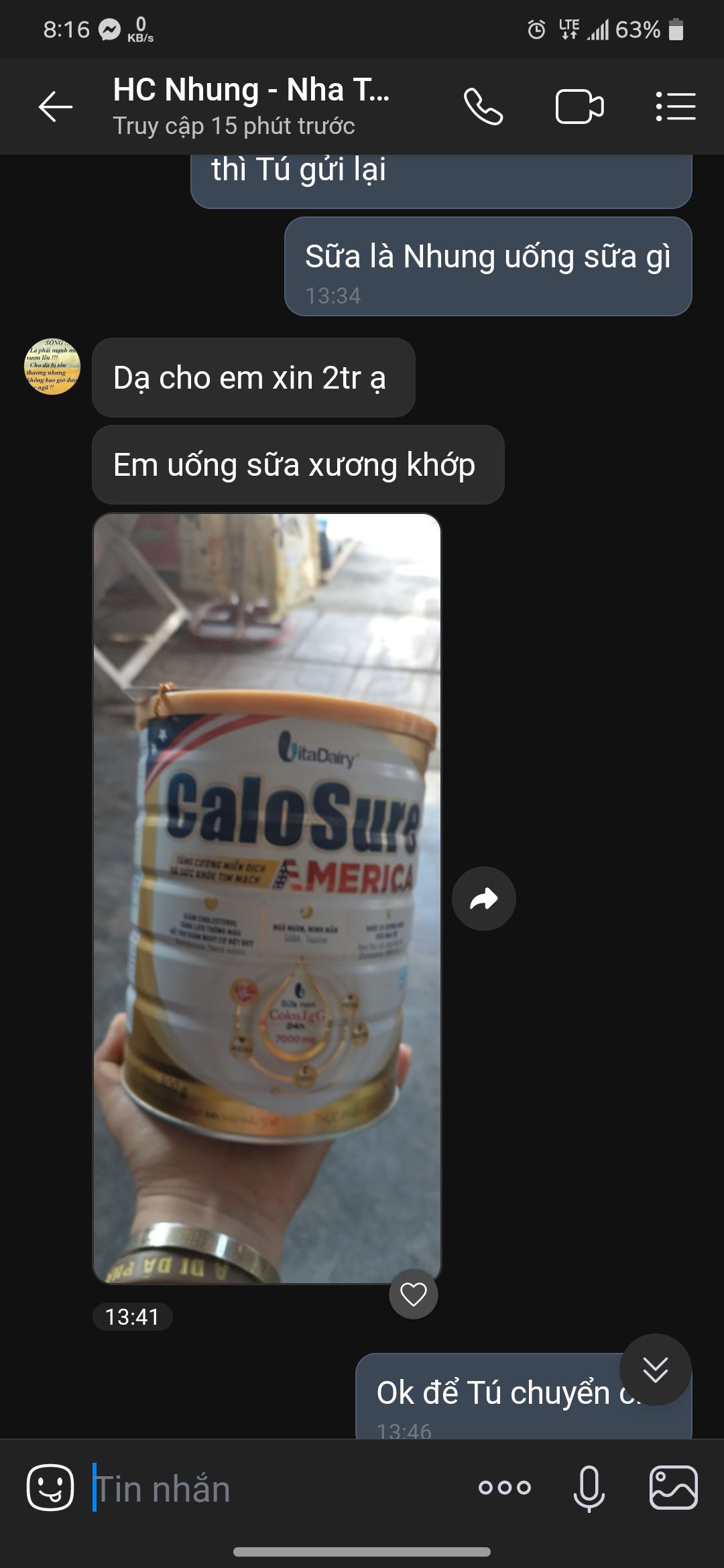 Ngày 28/10, Nhung có báo Tú nhờ hỗ trợ tiền để mua sữa uống hỗ trợ xương khớp. Letuantu đã chuyển 2,000,000đ từ khoản tiền Nhung được hỗ trợ.