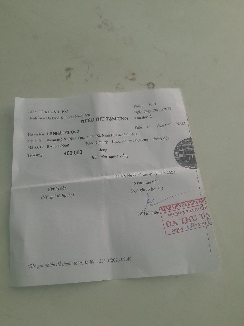 Hiện tại, Nhung đang nhờ letuantu giữ giúp 9,000,000đ tiền bệnh viện gửi lại sau khi trừ các chi phí đã đóng tạm ứng. Letuantu sẽ gửi lại khi nào Nhung cần.