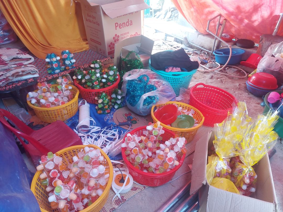 Gần Tết Nhung có nhận hàng gia công và bán các tháp đồ trang trí, tiền công mỗi cặp đc 5k. Thỉnh thoảng em có chảy máu miệng nhưng Nhung bảo vẫn cố được, gắng kiếm tiền nuôi con và để dành 2 triệu còn lại ở diễn đàn lúc cần.