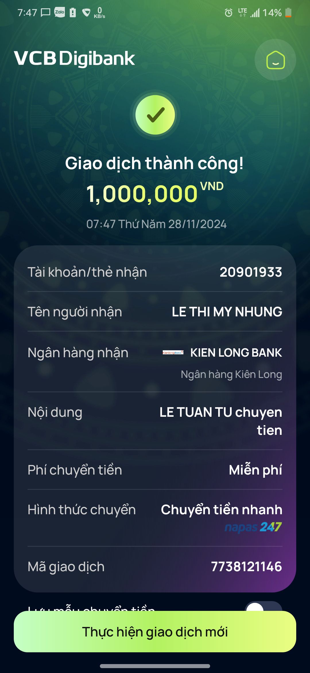 Nhờ TĐP duyệt chuyển tiền lại giúp letuantu.