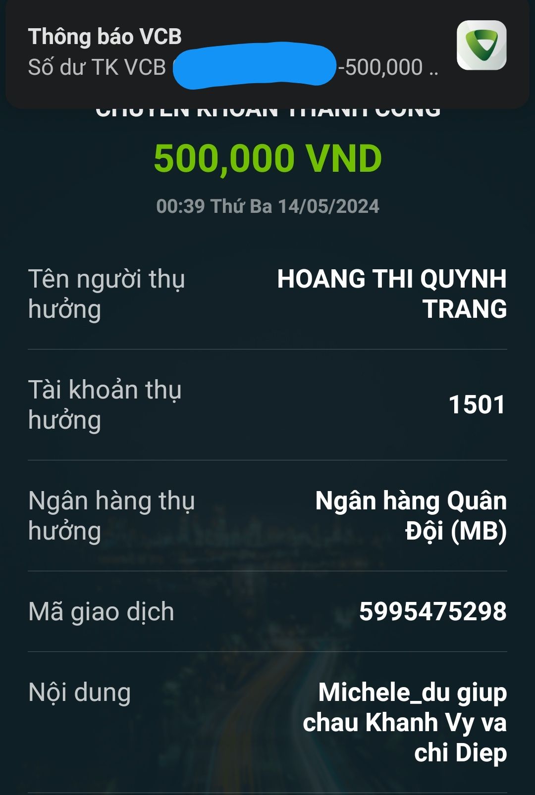 Michele_du và Gia đình ủng hộ chị Điệp và cháu Khánh Vy 500,000₫.