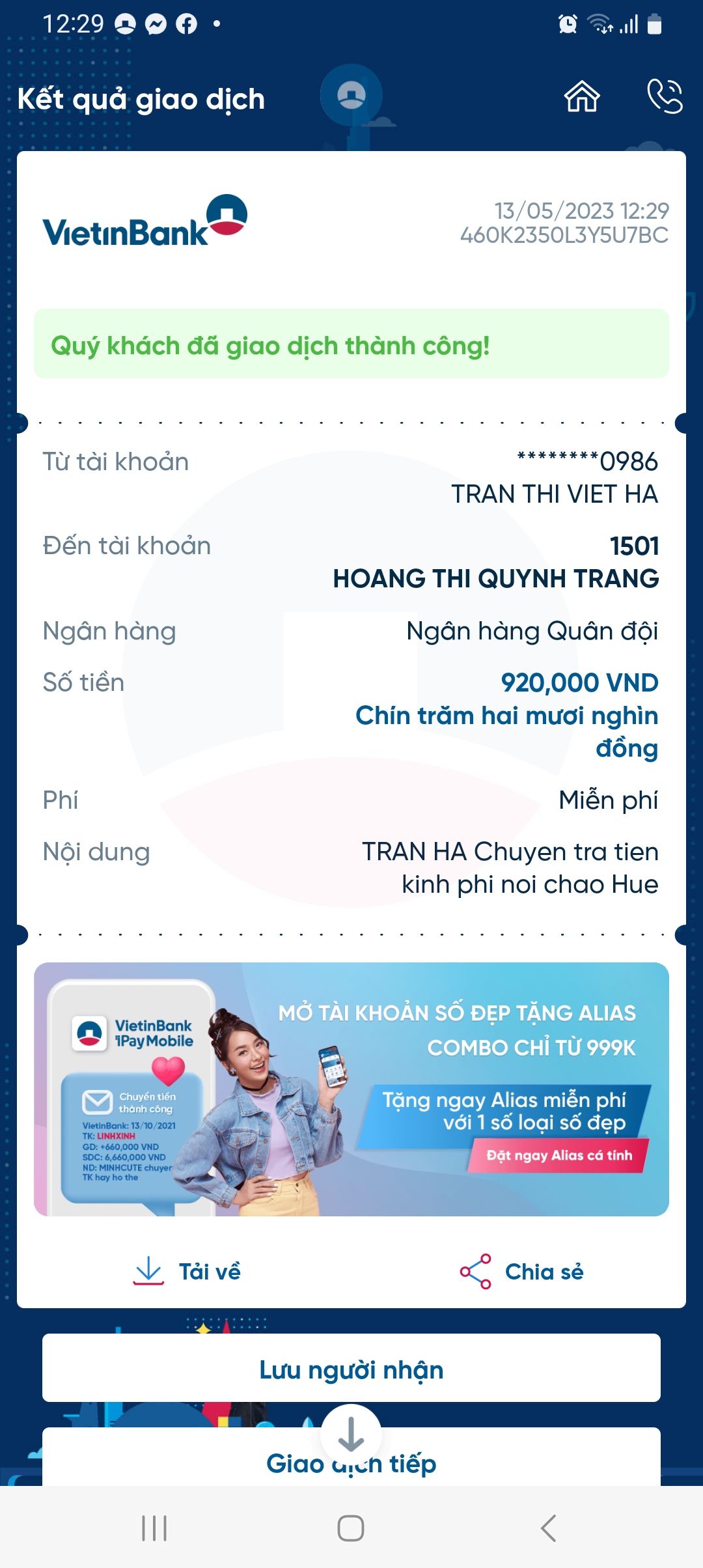 Tran Ha thôi giữ quỹ đi chợ NC Huế và đã chuyển trả tạm ứng đi chợ còn lại là 920,000đ sau khi trừ chi phí tuần 1 tháng 5/23.Tuy nhiên Tran Ha đã chuyển trả nhầm quỹ NTCM. Đề nghị tổ điều phối điều chuyển lại quỹ cơm cháo. Cảm ơn.