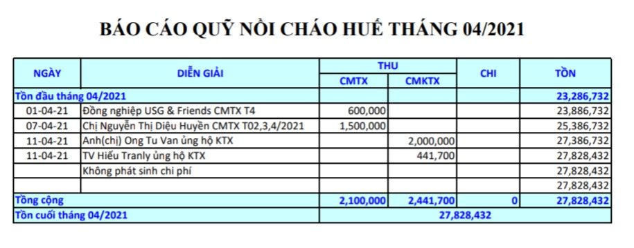 Theo báo cáo thống kê thì tồn quỹ Nồi cháo Huế cuối tháng 4/2021 là 27,828,432đ nha các bạn.